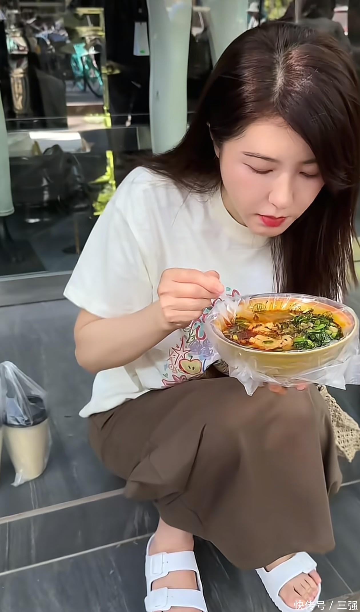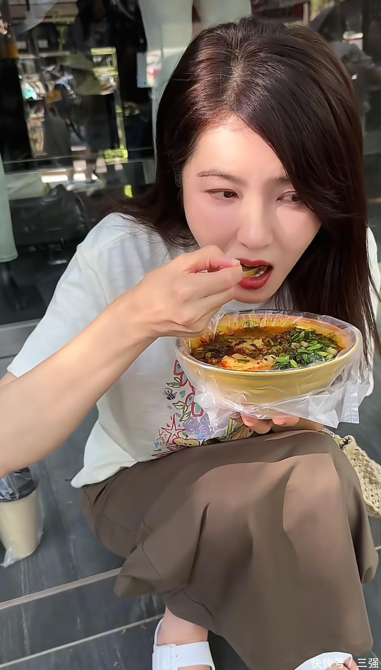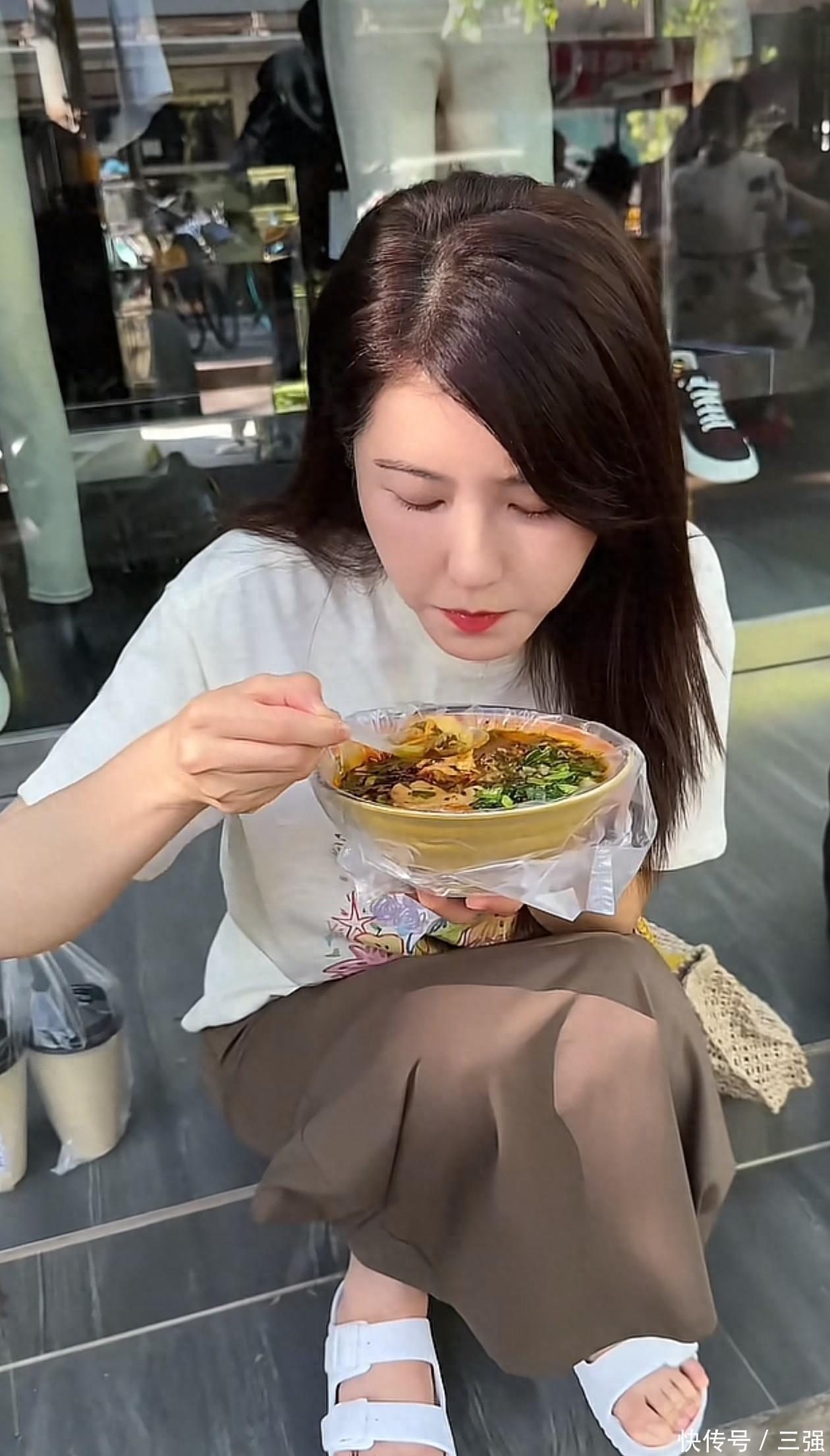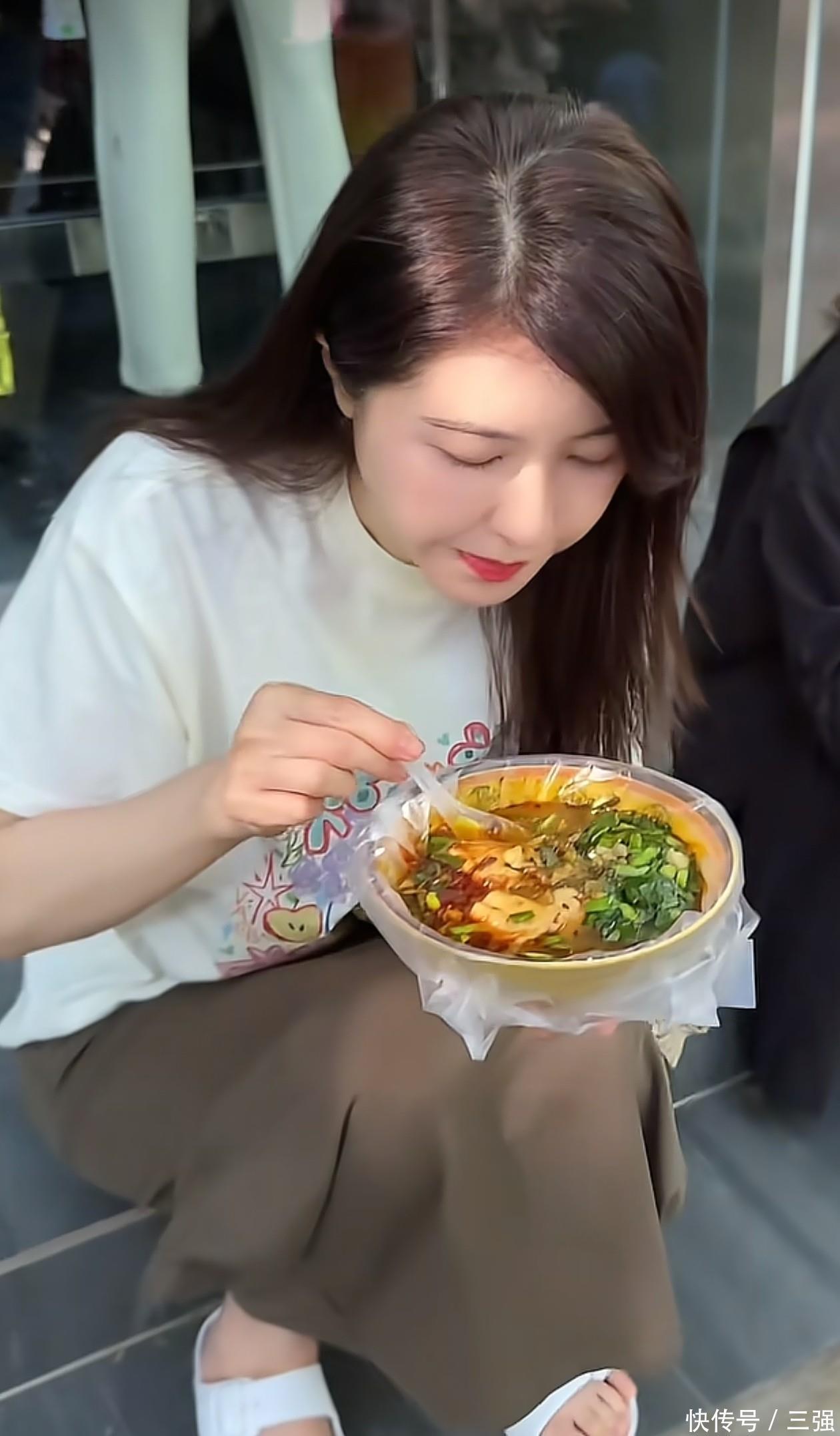 曾黎脚上穿了一双纯白色凉鞋,私下的她不喜欢浓妆艳抹,不管是脚趾甲还是手指甲,都没有染色。这身穿搭版型都挺宽松,所以夏天穿的话不仅凉快,还不会有紧绷感。仔细看曾黎身后,背后很有可能是一家衣服店。她直接坐在外边台阶上大口吃豆腐脑,一手端着碗,一手拿勺子往嘴里喂,看她吃就觉得好香。