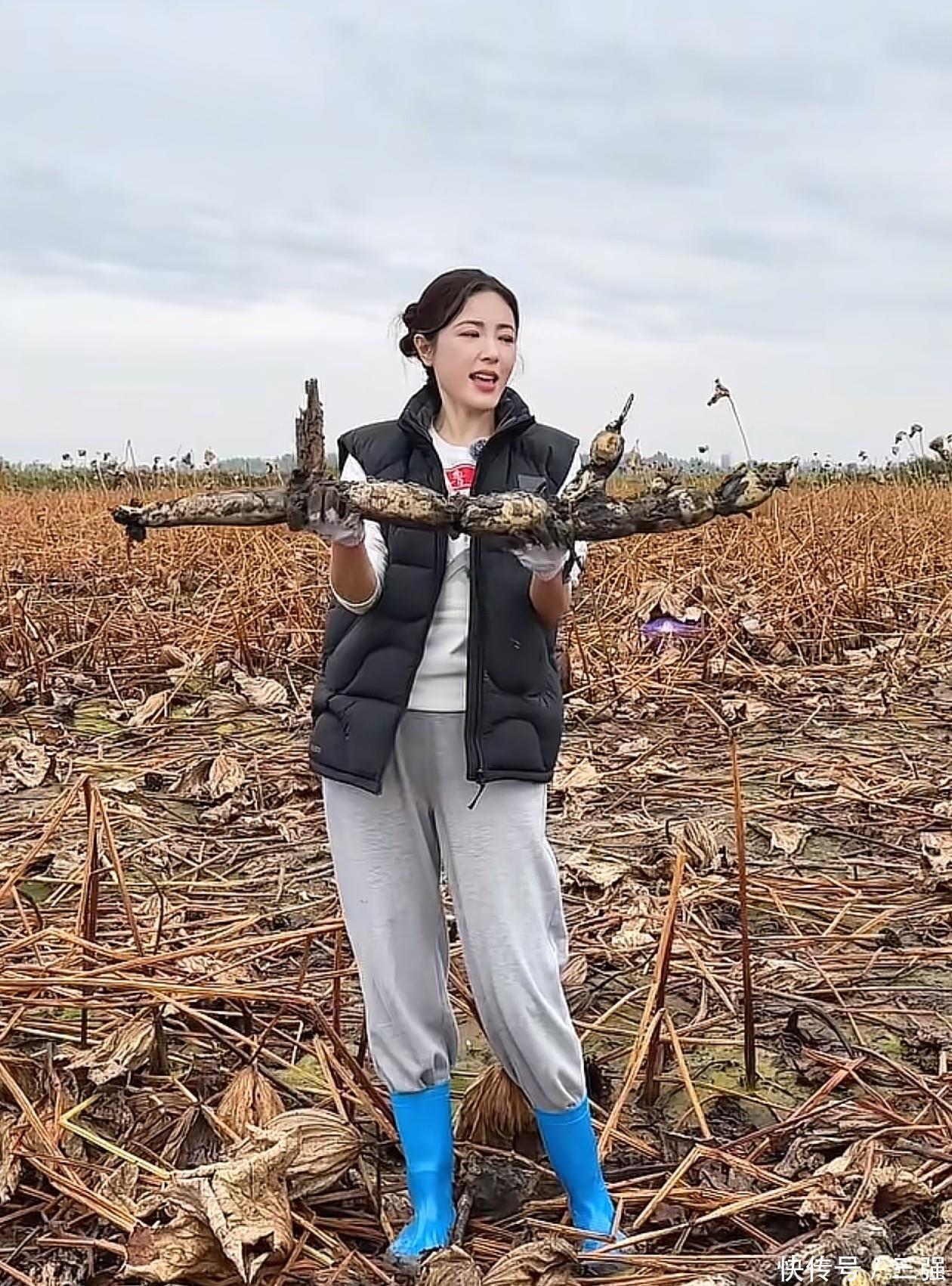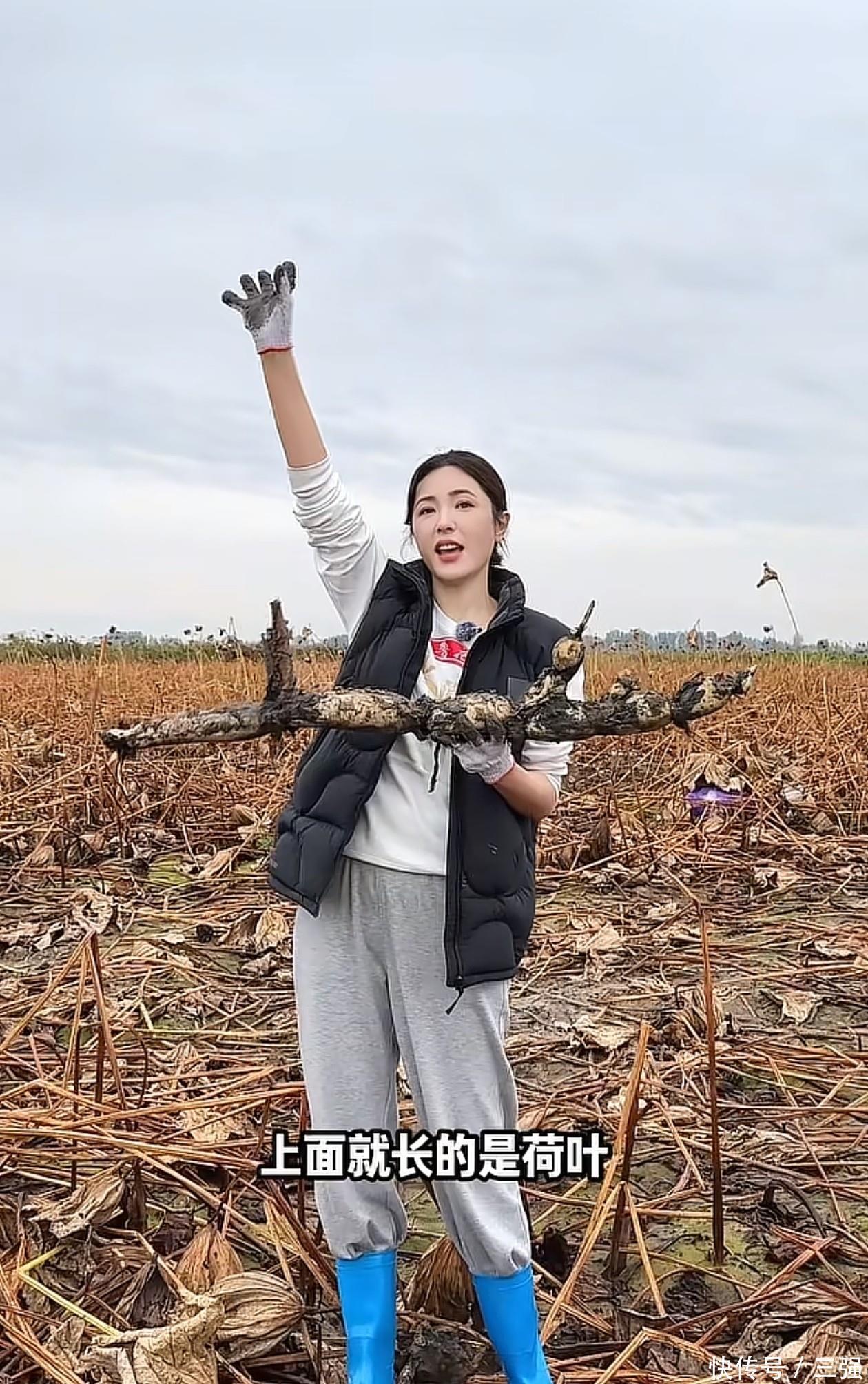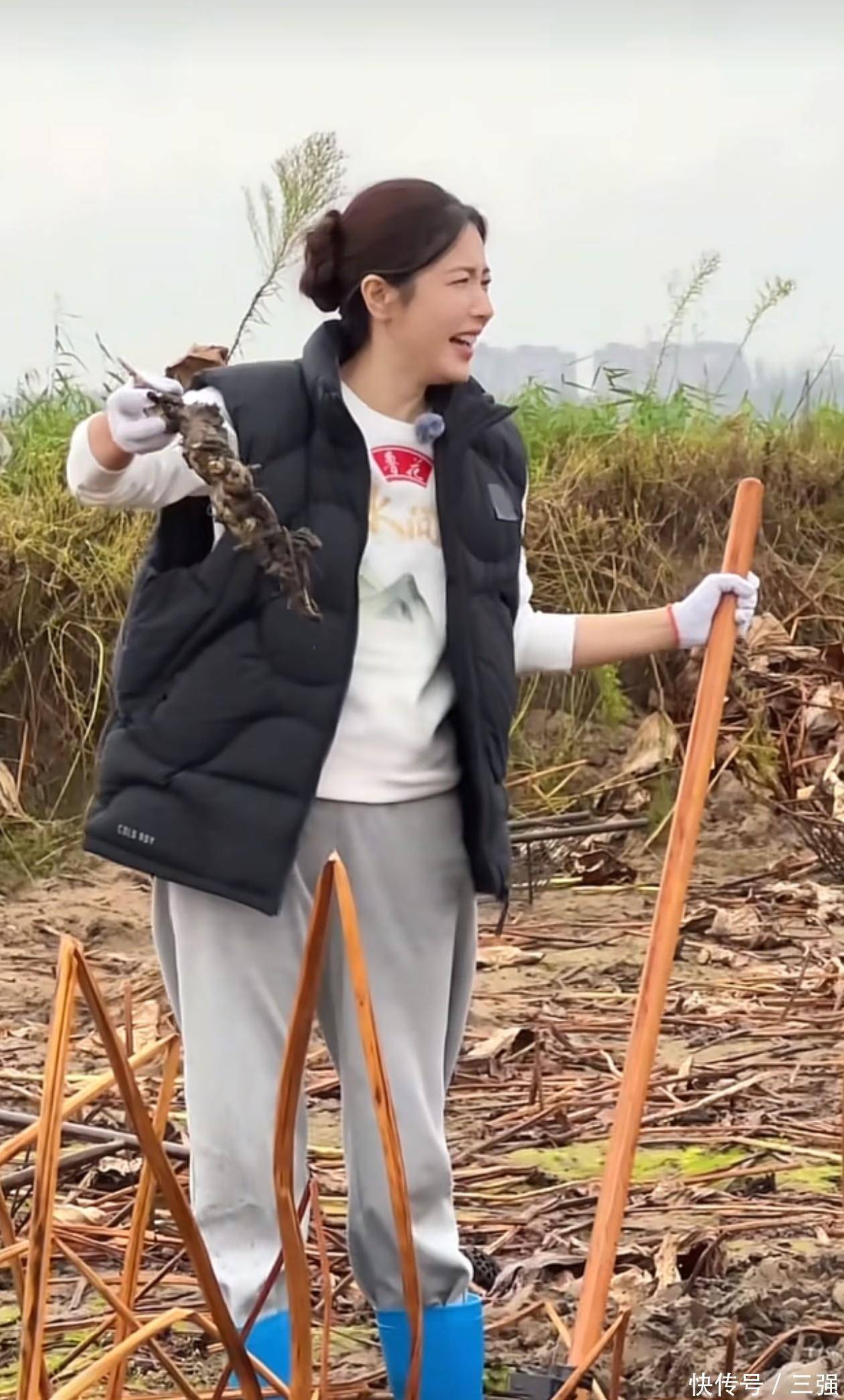 地里挖藕的曾黎看着很开心,手里捧着劳动成果大方向大家展示。下地干活的女神穿着朴素,上半身是卫衣+马甲,卫衣面料不是冬天的加绒款,所以春秋季穿刚刚好。外层的羽绒马甲保暖性好,面料为黑色,一来与白色形成颜色对比,二来黑色面料很耐脏,适合地里干活穿。